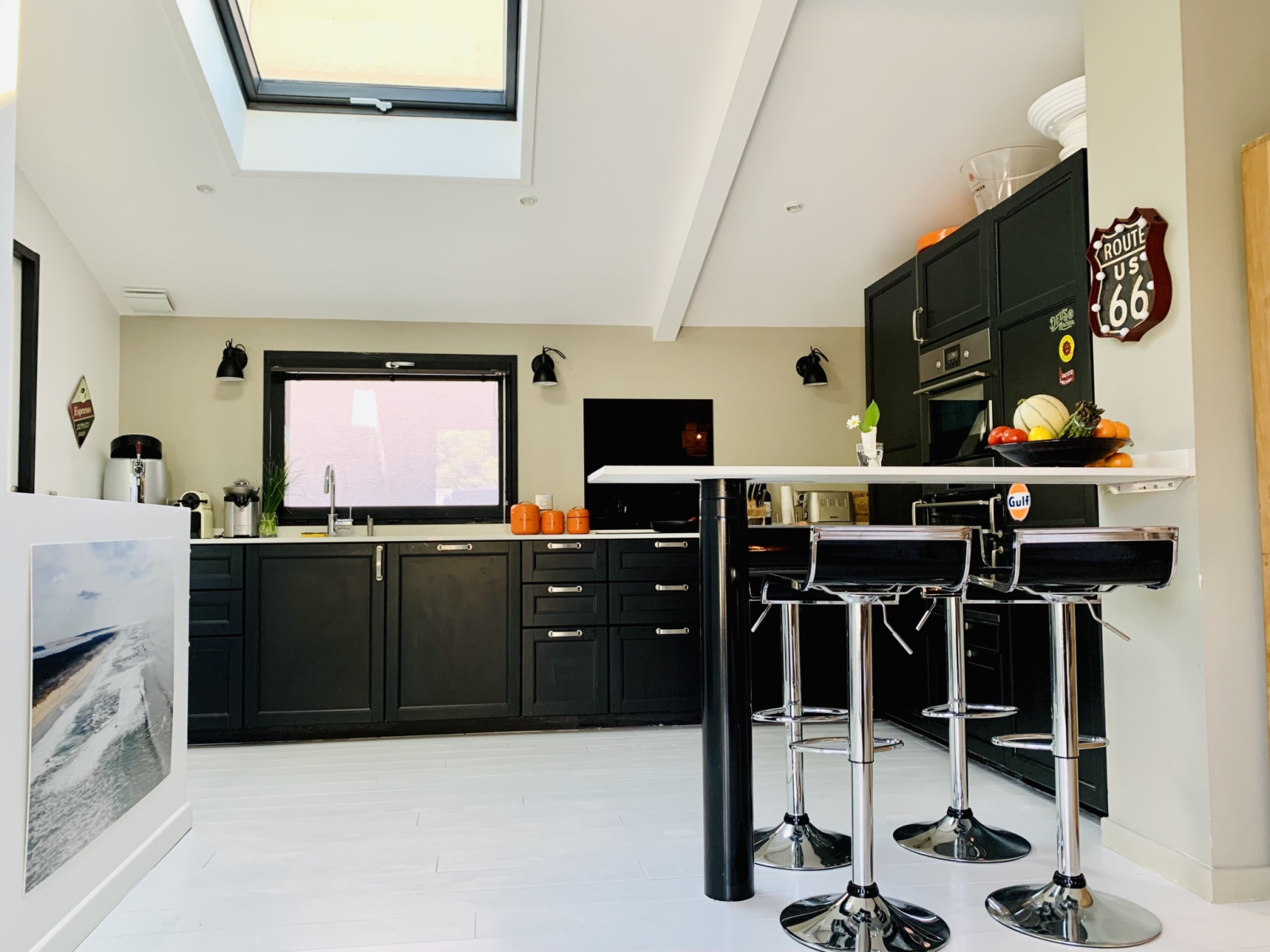 La maison possède une cuisine américaine très bien équipée avec un petit bar, et tabourets, qui sépare la cuisine de l'espace salle à manger-salon. Il y a 4 grandes chambres avec pour chacune une salle d'eau privative. La plupart des chambres donnent sur une grande terrasse située à l'arrière de la maison (transats).