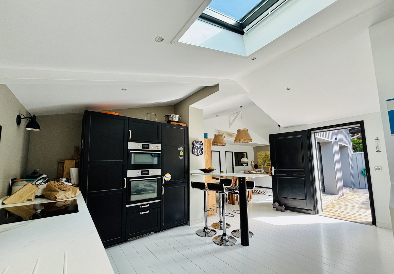 Cette magnifique maison moderne bénéficie d'une grande pièce de vie lumineuse, ouverte sur une grande terrasse arborée de 80 m2, idéale pour les repas en famille ou entre amis (parasol, salon extérieur composé de banquettes avec coussins, plancha).