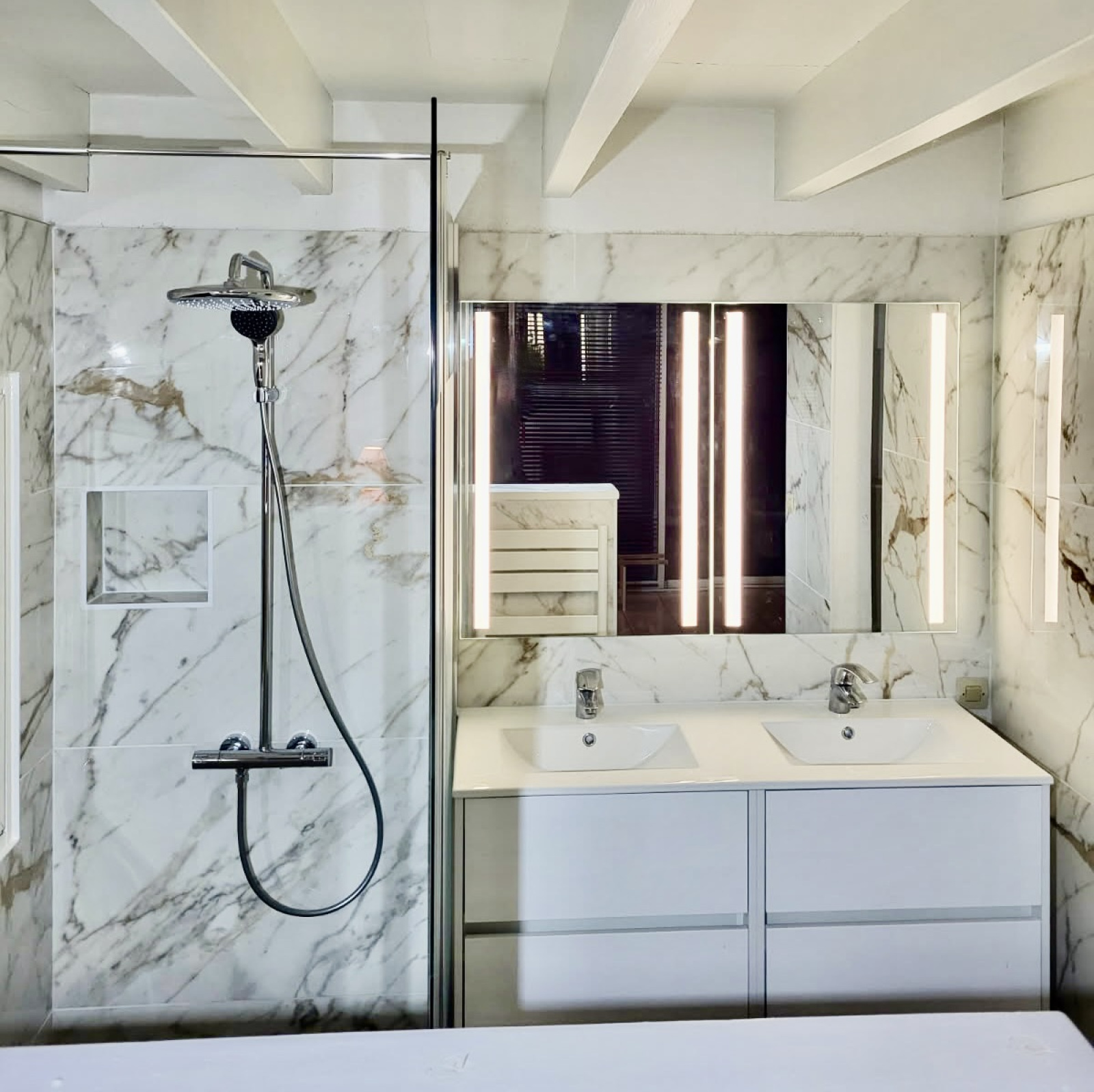 La terrasse est en bois exotique, équipée de 4 bains de soleil, et 2 salons d’été avec canapés et fauteuils.