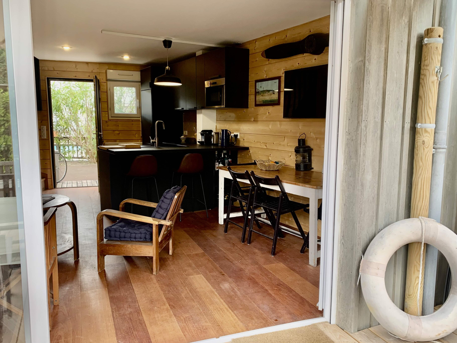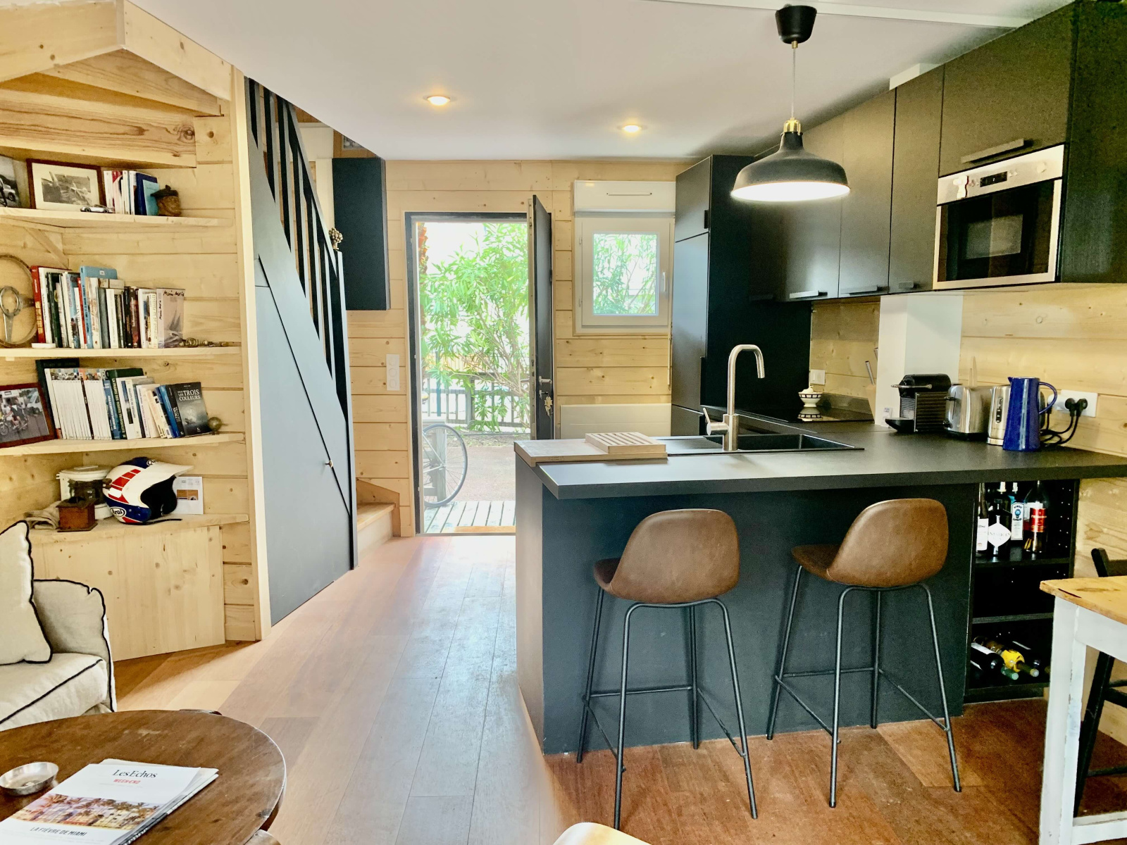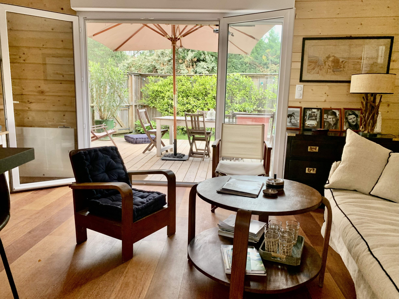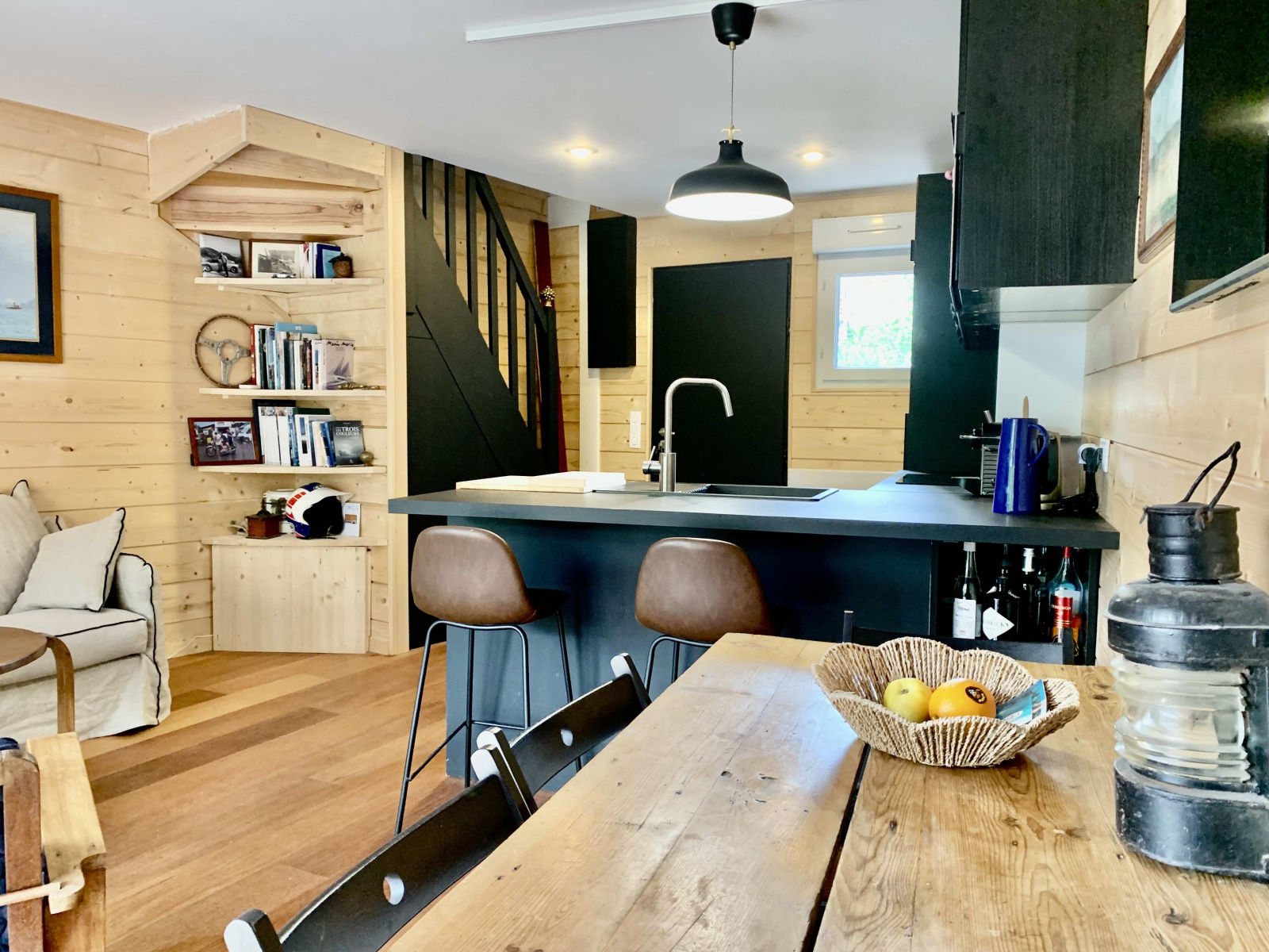 Cuisine américaine avec bar / Salle à manger et espace salon ouvrant sur la terrasse arborée plein ouest. Etat: Très bon état