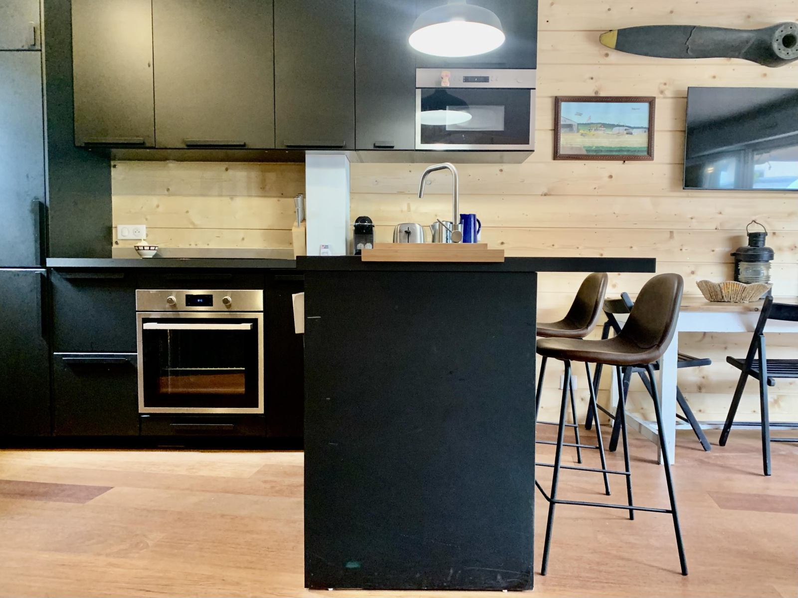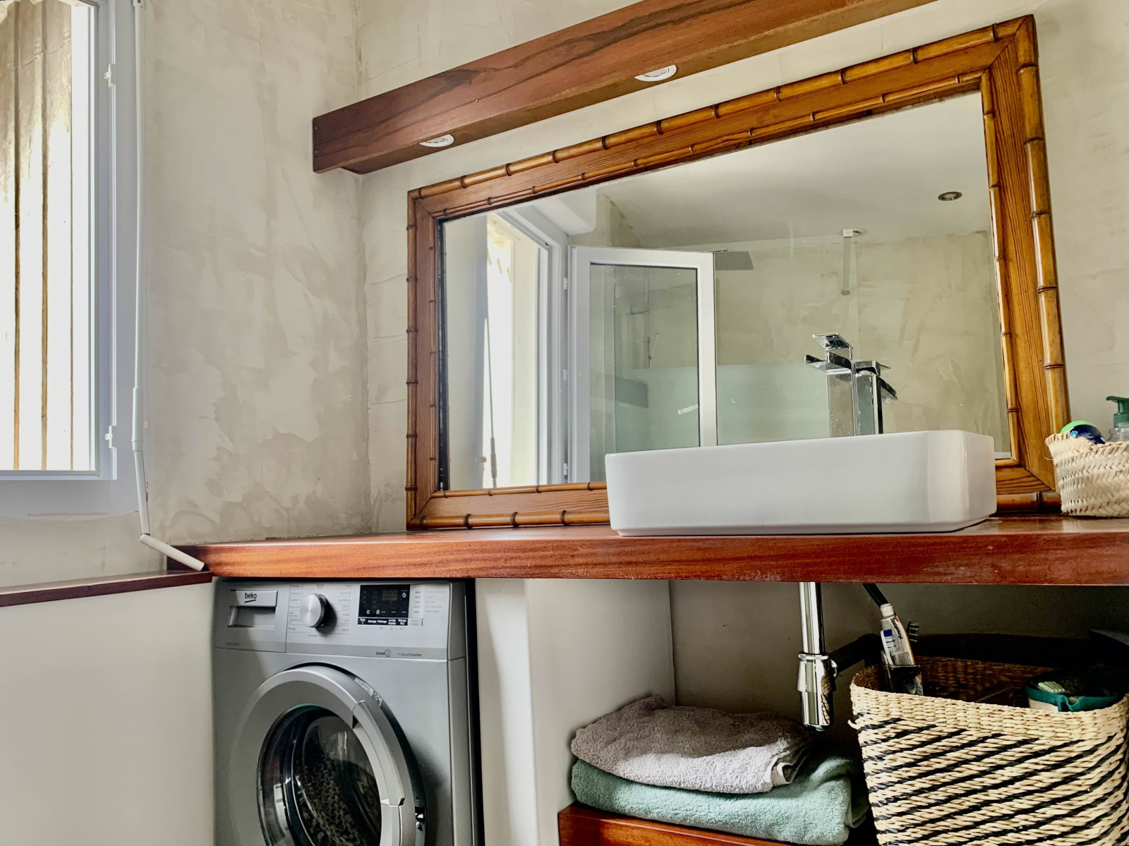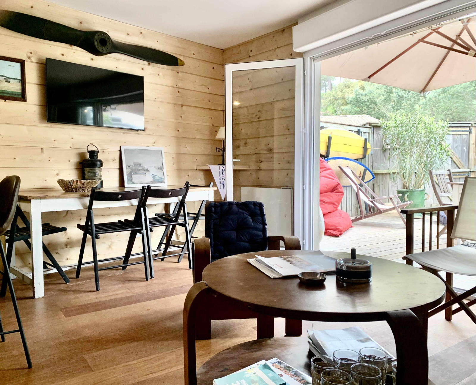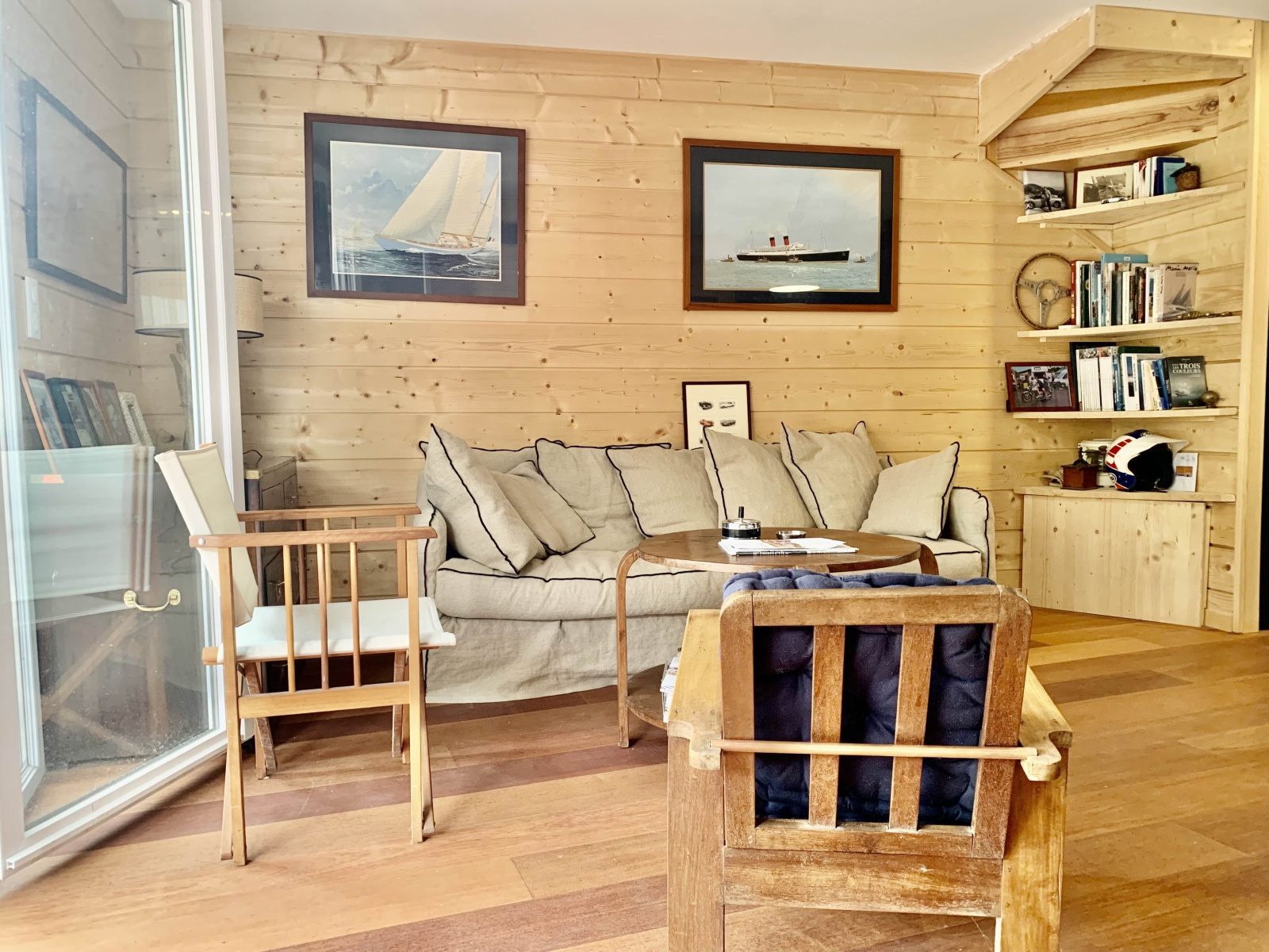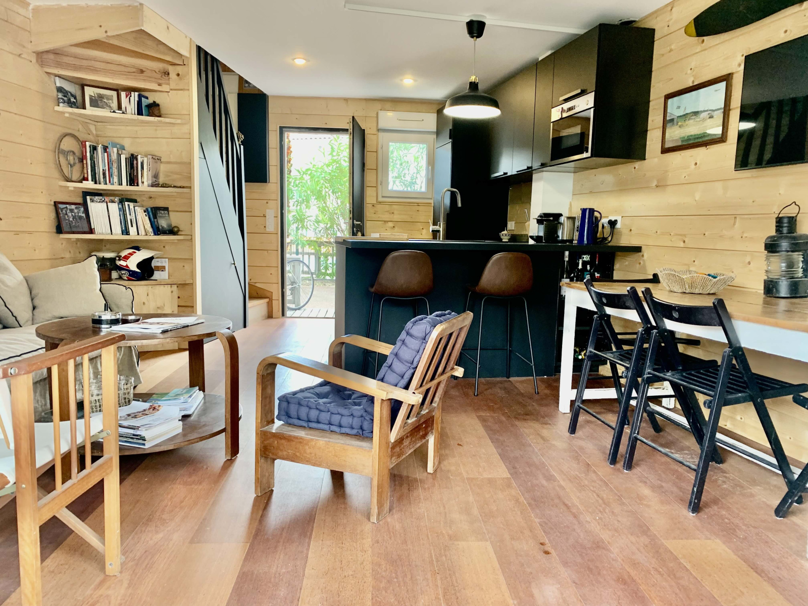 Cuisine américaine avec bar / Salle à manger et espace salon ouvrant sur la terrasse arborée plein ouest. Etat: Très bon état