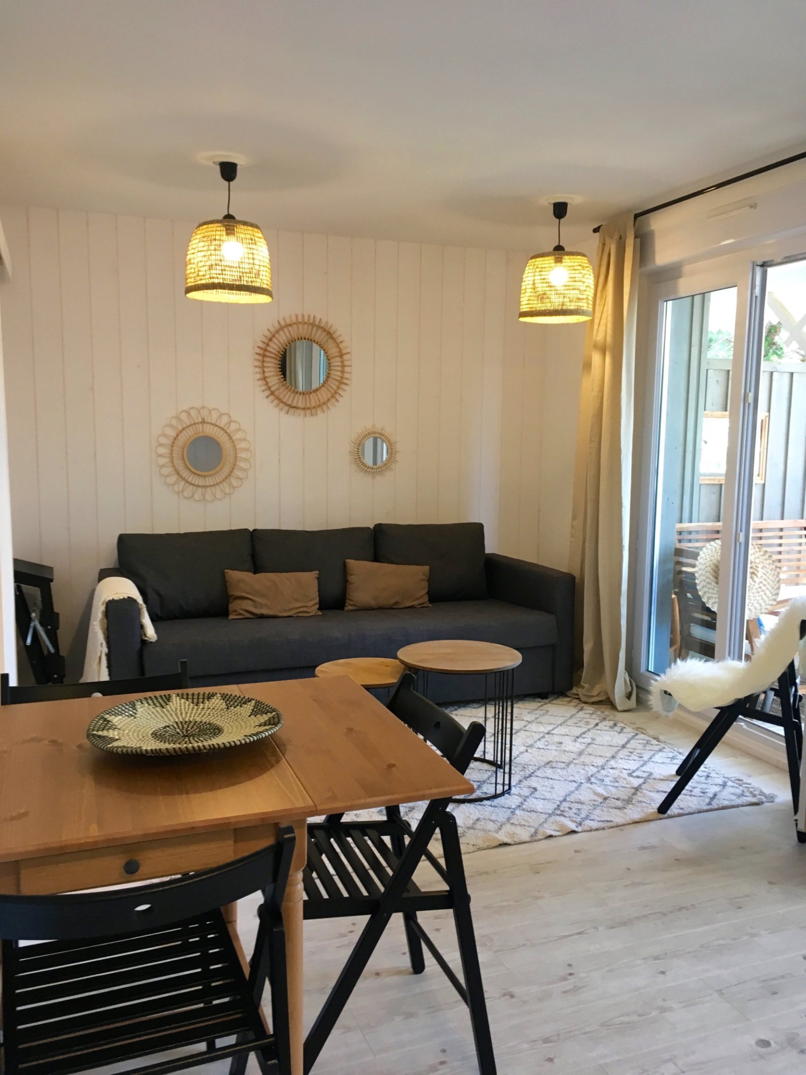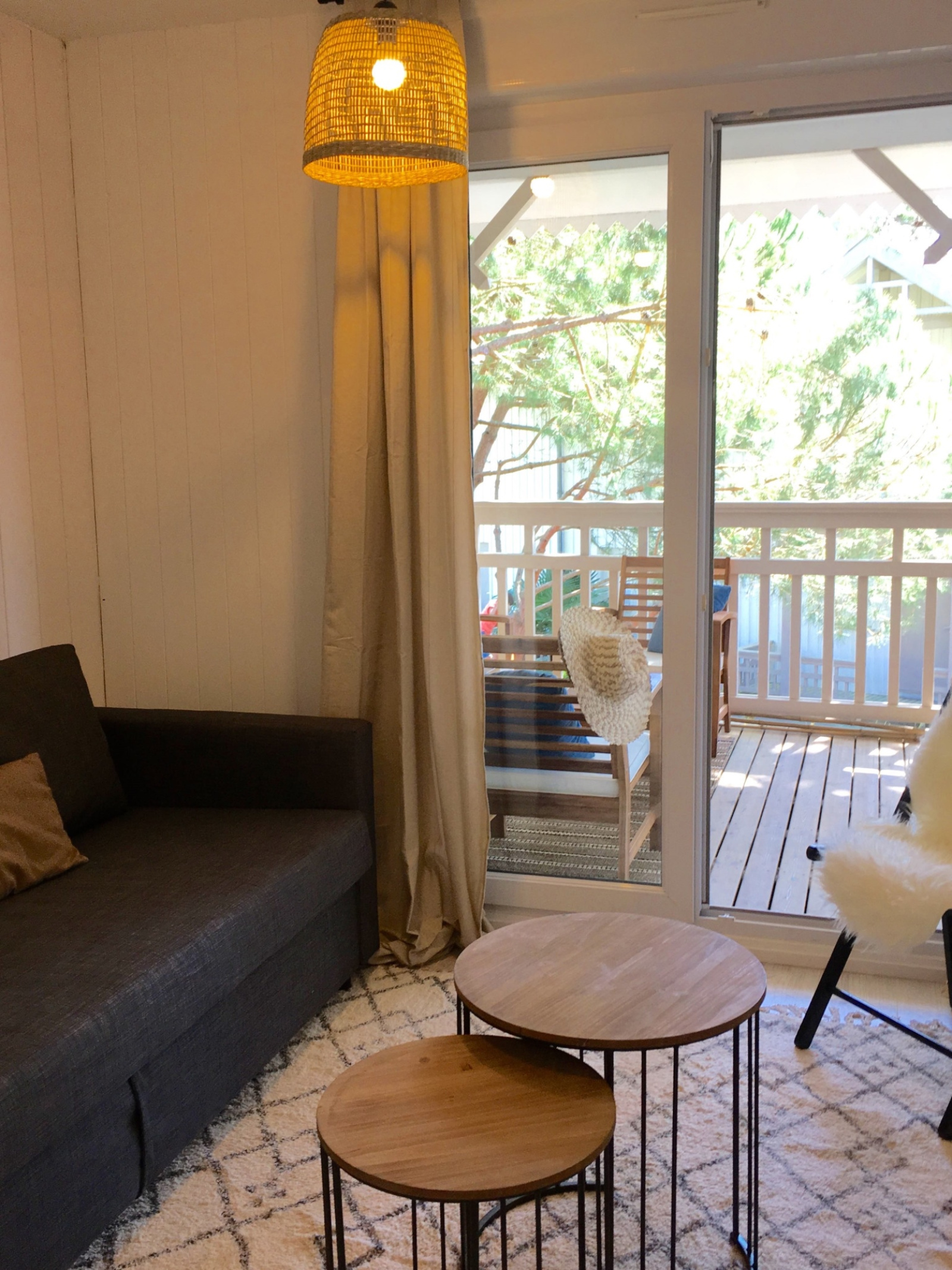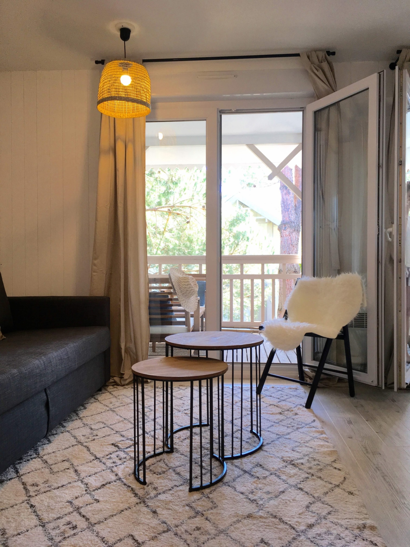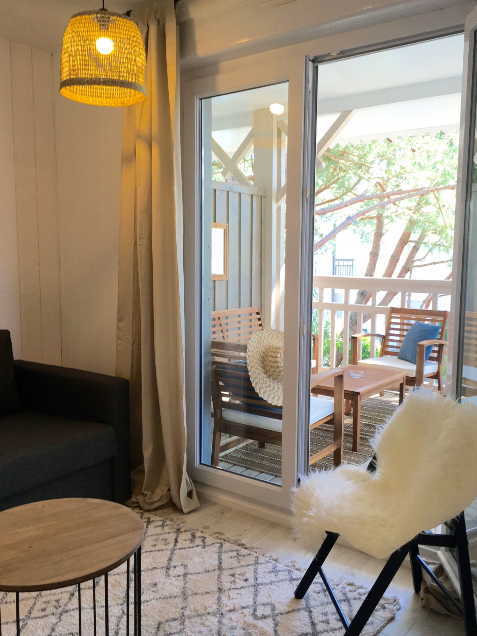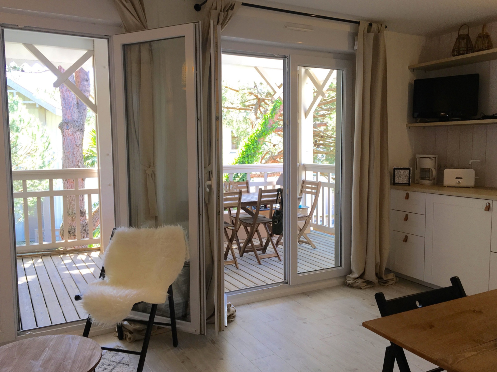 L'appartement est tout juste re décoré avec beaucoup de goût (nouvelle salle d'eau, nouvelle cuisine américaine) : Bel espace facile et fonctionnel, situé au 1er étage. Il y a 2 chambres indépendantes (dont une en "cabine" toute petite mais efficace). La pièce de vie donne sur une grande terrasse aménagée (couverte) avec vue sur les arbres et la piscine de la résidence ! Il y a une place de parking.