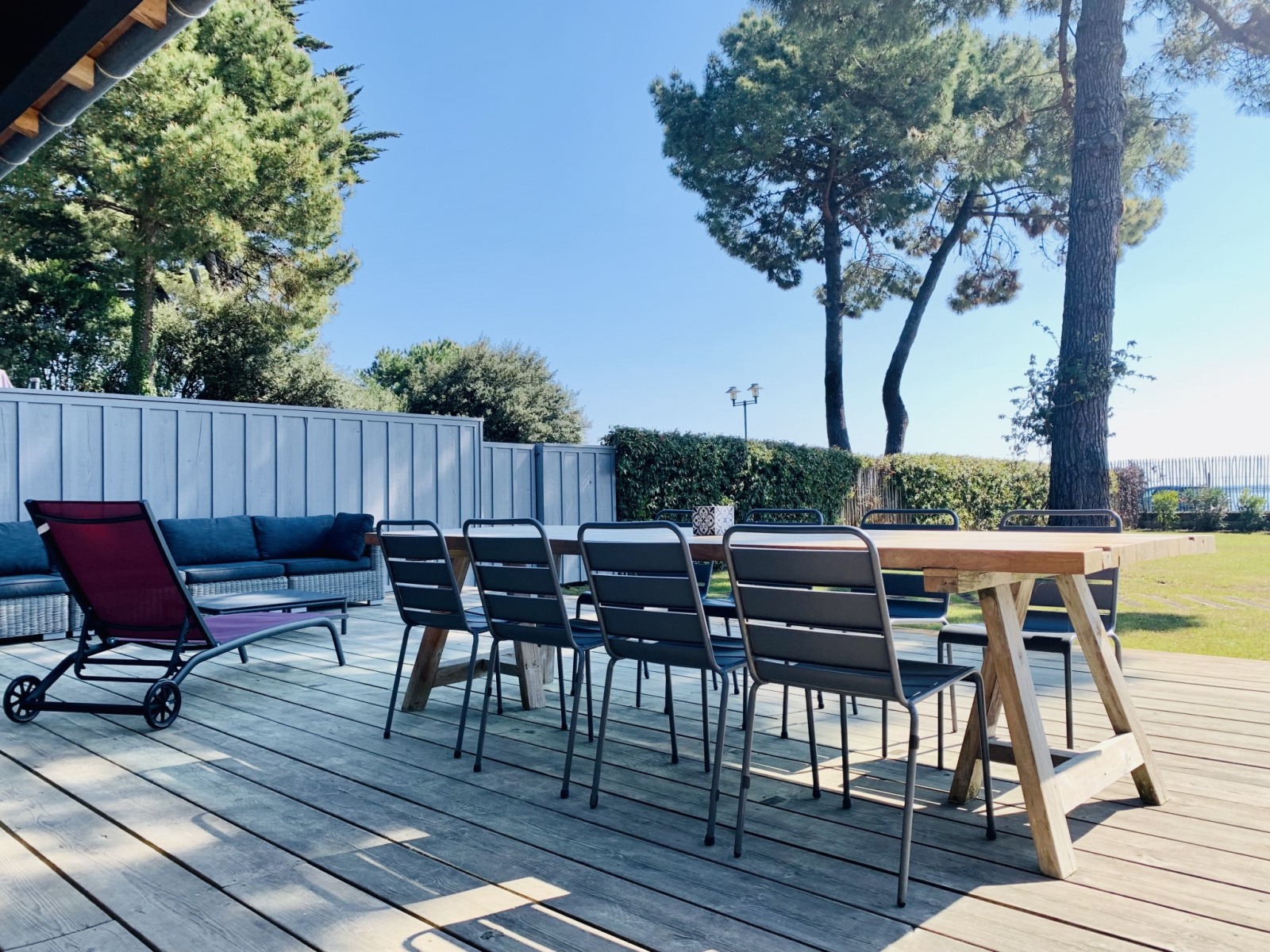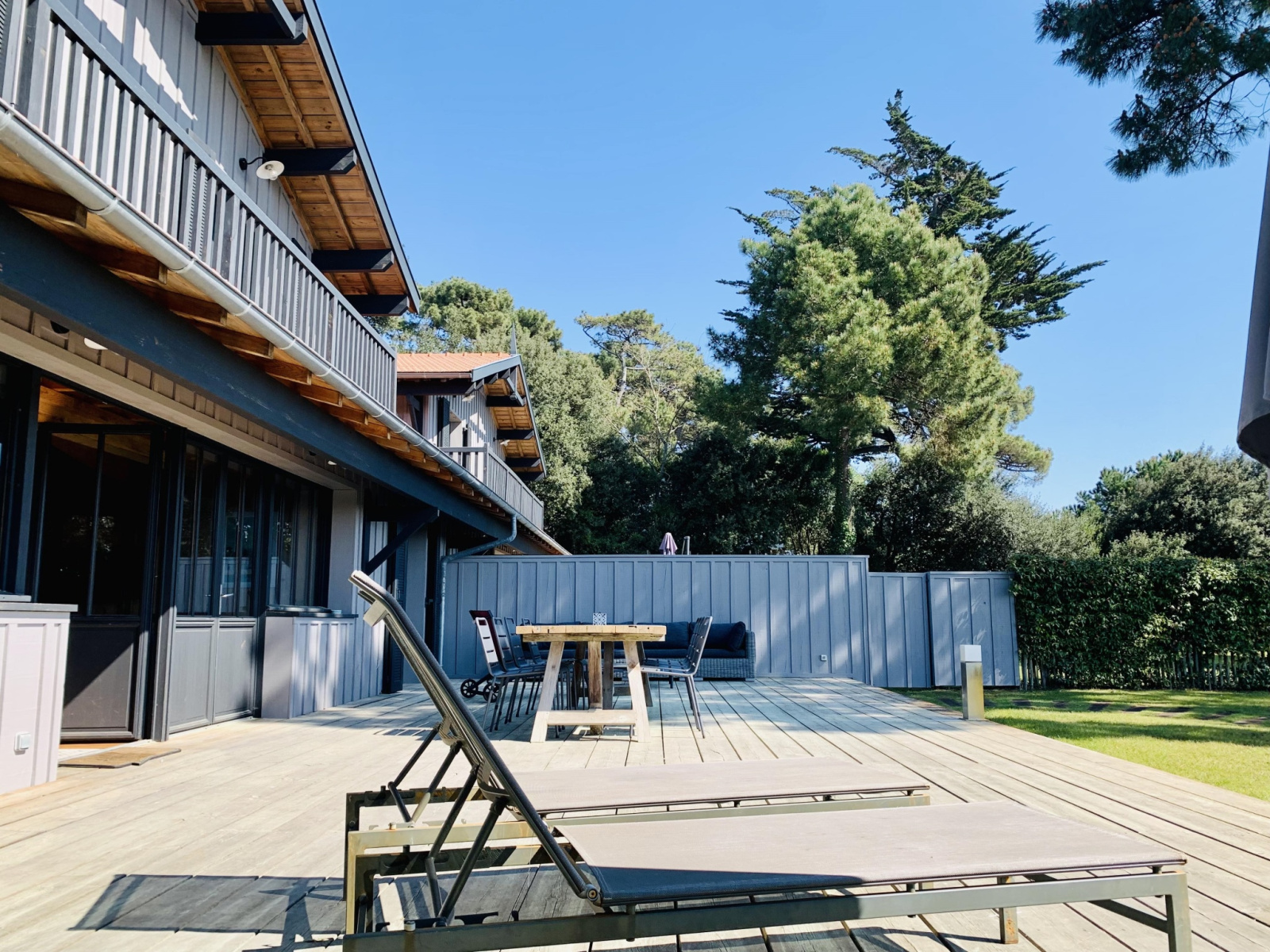 Terrasse équipée de mobilier de jardin (1 table bois, 12 chaises, canapés extérieurs, chaises longues, bains de soleil, parasol, BBC)