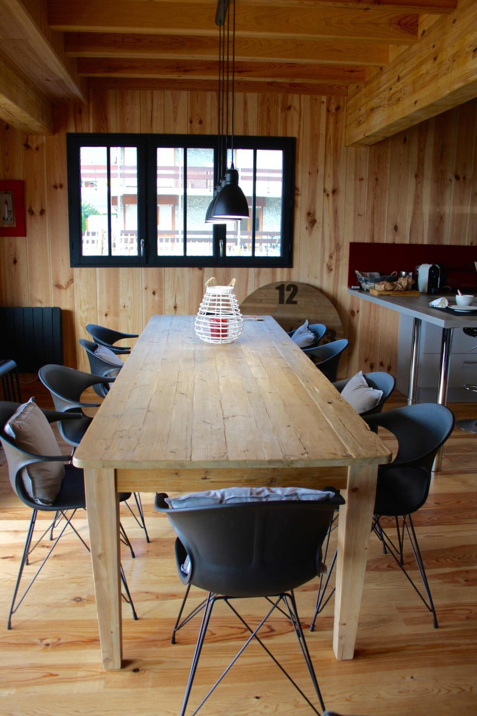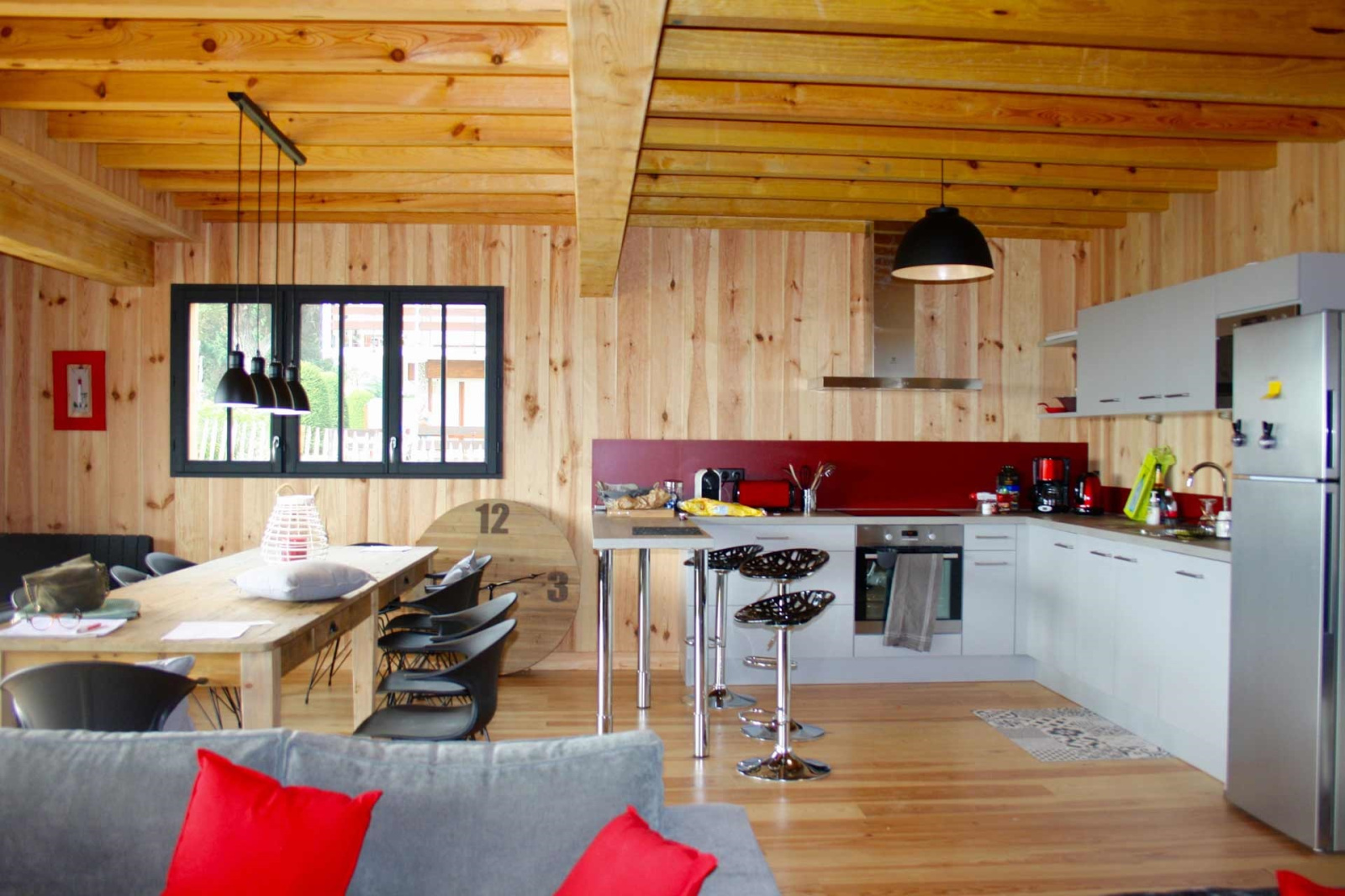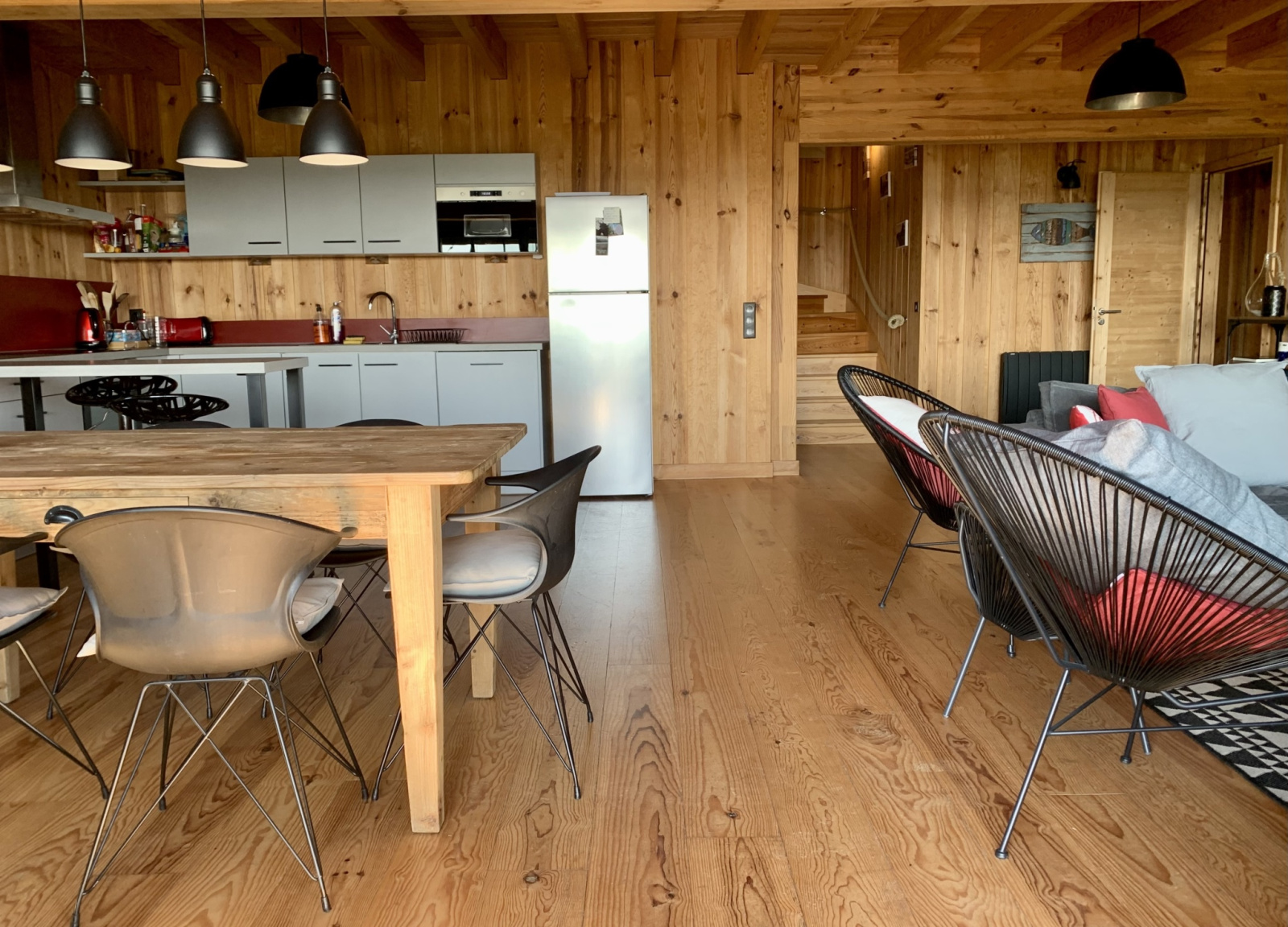 Rdc : Une vaste pièce de vie avec cuisine américaine (entièrement équipée), une grande table de salle à manger collective et un espace salon avec canapés (entrée et cellier), une grande suite parentale et sa salle d'eau.