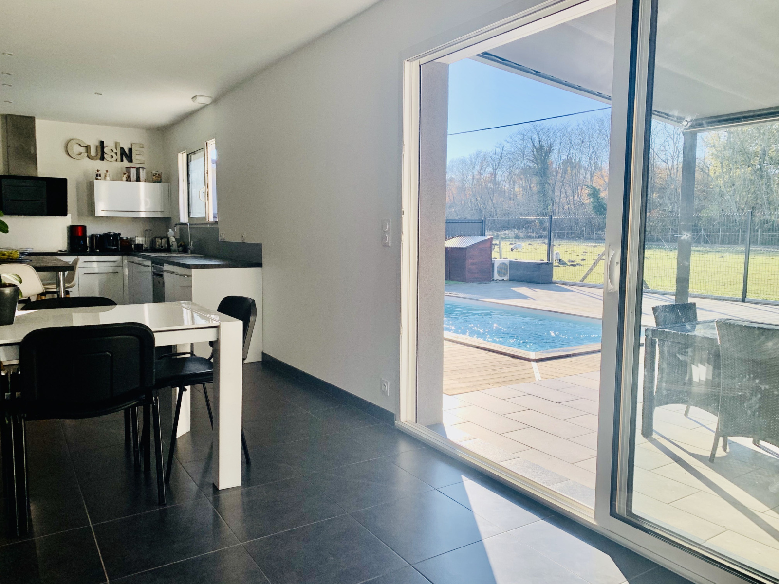 Le hall d'entrée ouvre de part et d'autre sur un espace bureau et un double dressing, puis vous pénétrez dans la grande pièce de vie lumineuse composée d'une partie salon et d'une belle cuisine américaine avec îlot (cellier) et salle à manger. L'ensemble donne sur le jardin composé d'une terrasse extérieure avec pergola et d'une piscine 6x3 chauffée. La maison possède 3 belles chambres, et deux salles d'eau.